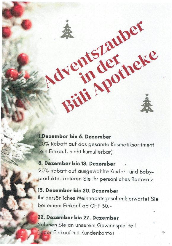 In der Büli Apotheke und Parfümerie können Sie nicht nur Arzneimittel kaufen, sondern auch diverse Serviceleistungen in Zusammenhang mit Ihrer Gesundheit und Schönheit in Anspruch nehmen. Wir können die wichtigsten Gesundheitsmesswerte bestimmen, deren Bedeutung erklären und Ihnen wertvolle Informationen mit auf den Weg geben. In vielen Fällen sparen Sie sich einen Arztbesuch und erhalten in unseren Apotheken die Lösung für Ihr Problem.